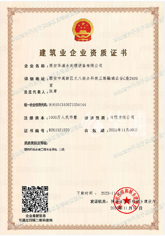 近日,西安華浦環(huán)保水處理設(shè)備有限公司建筑機(jī)電安裝工程資質(zhì)升為二級(jí)。此次資質(zhì)等級(jí)的提升,使我司資質(zhì)等級(jí)和專業(yè)水平又上了一個(gè)新臺(tái)階,進(jìn)一步增強(qiáng)了公司的市場(chǎng)競(jìng)爭(zhēng)能力,為公司做大做強(qiáng)打下了堅(jiān)實(shí)的基礎(chǔ)。
